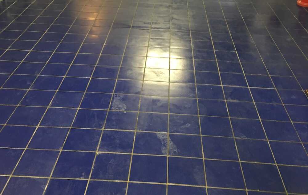 施工2日目。剥離と滑り止め施工を終えたタイルにあの見事なコバルトブルーの面影は全くありません。特殊コーティング作業の準備に入ります。タイルの1枚1枚に塗り込んでいきます。