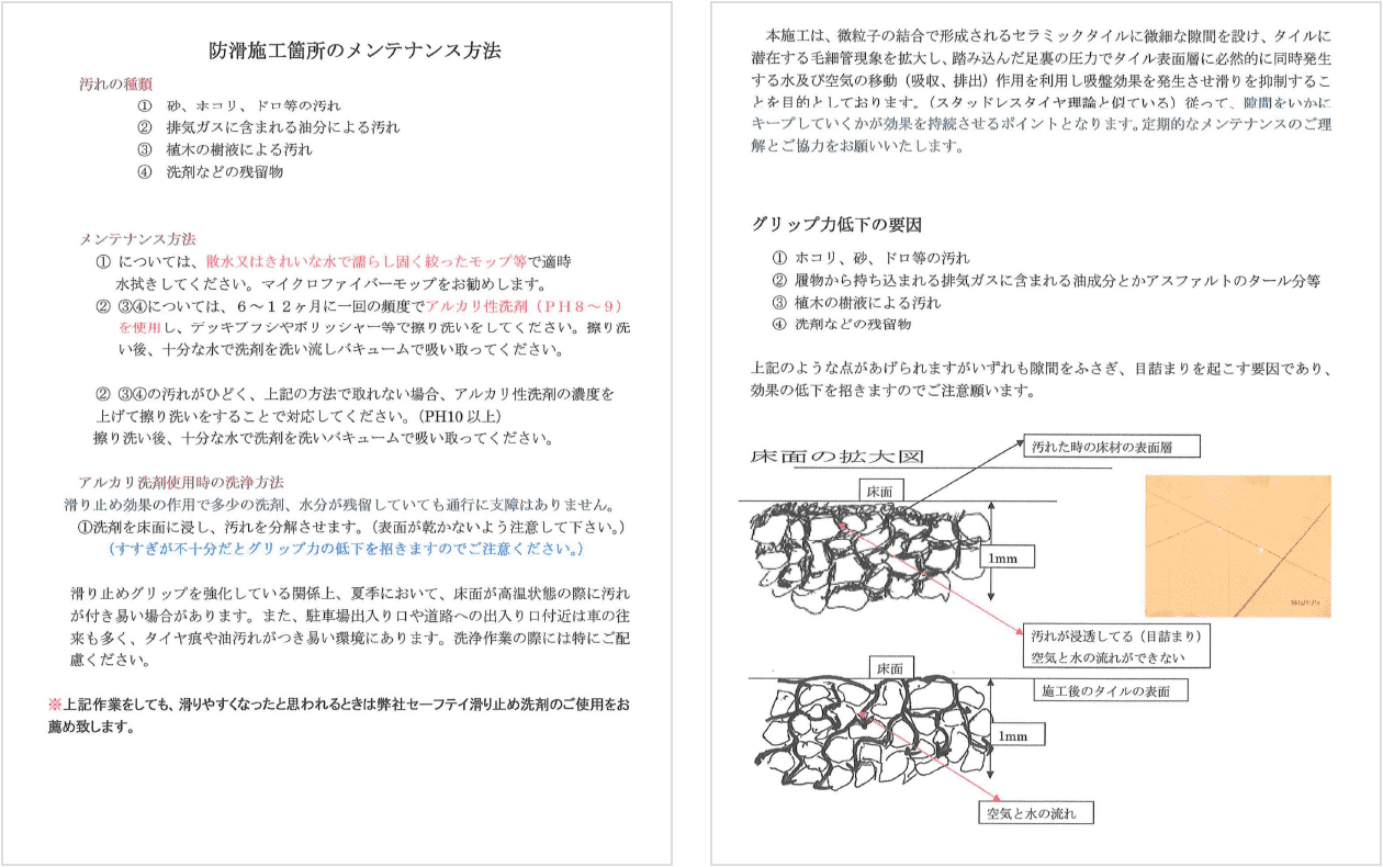 これらの情報を元に、弊社では防滑施工後のメンテナンスマニュアルを発行しています。グリップ力を低下させる原因、発生する汚れの種類、具体的な洗剤、メンテナンス頻度・方法まで、その現場・体制に合ったマニュアルを作成し、維持に努めていきます。ちなみにマニュアルの発行は、弊社が2001年に始めたのが最初です。