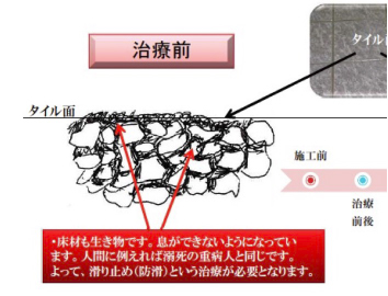 防滑施工によって、微細な隙間、穴を空けるなどの化学反応を経た床材は、施工前より水や空気の通りがよくなっています。そこに目に見えないミクロレベルの埃、油脂などが、隙間に入っていきます。滑りはそれらが滞留し目詰まりを起こすことで起こります。